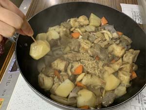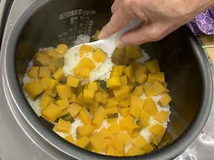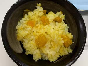 毎年10月は、かぼちゃご飯を作ります。ほんのり甘くて食べやすいご飯です。
